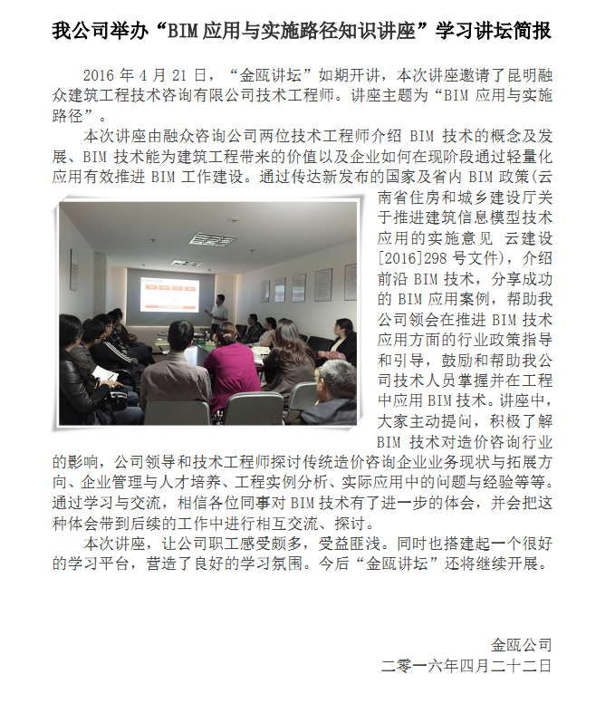 我公司舉辦“BIM應(yīng)用與實(shí)施路徑知識(shí)講座”學(xué)習(xí)講壇簡(jiǎn)報(bào)