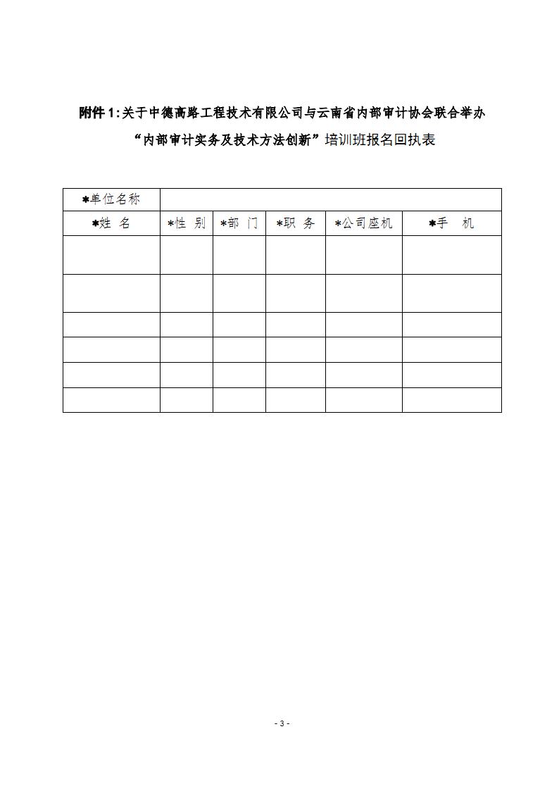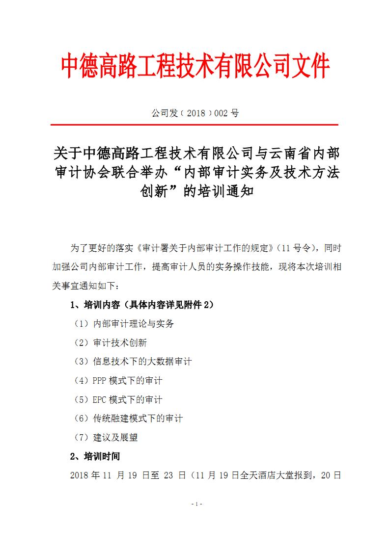 關(guān)于中德高路工程技術(shù)有限公司與云南省內(nèi)部審計協(xié)會聯(lián)合舉辦“內(nèi)部審計實務(wù)及技術(shù)方法創(chuàng)新”的培訓(xùn)通知