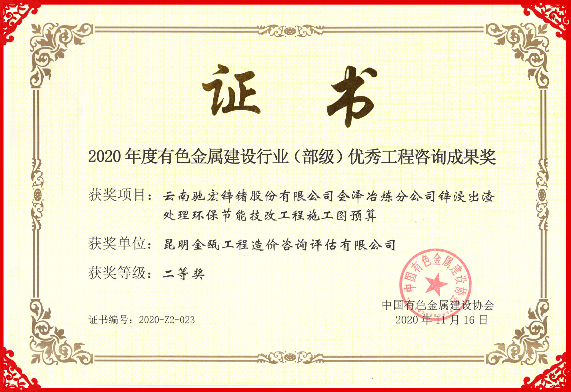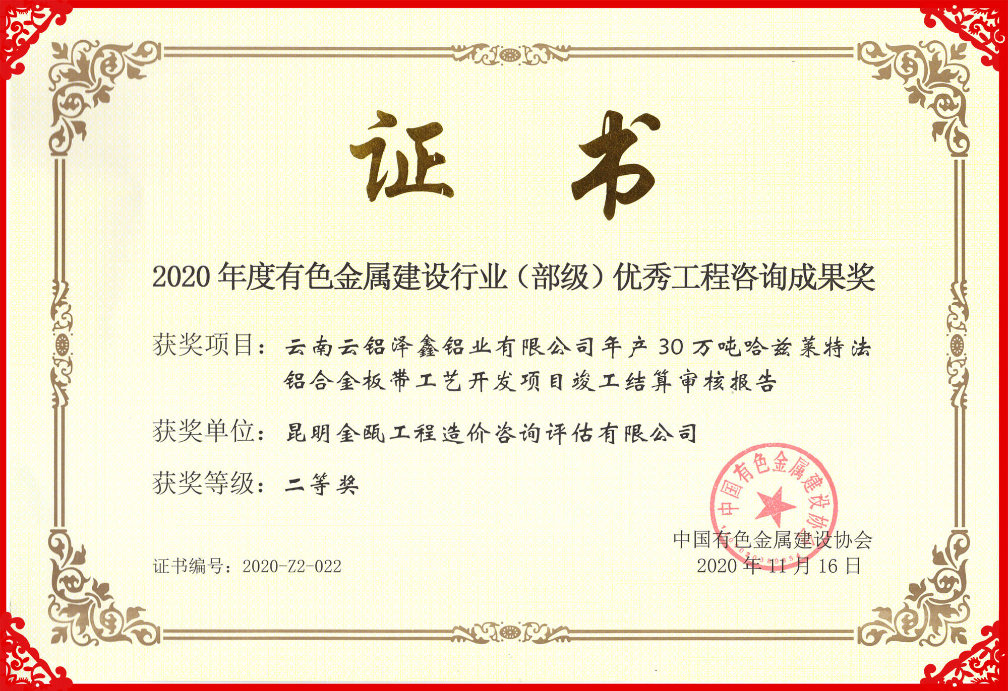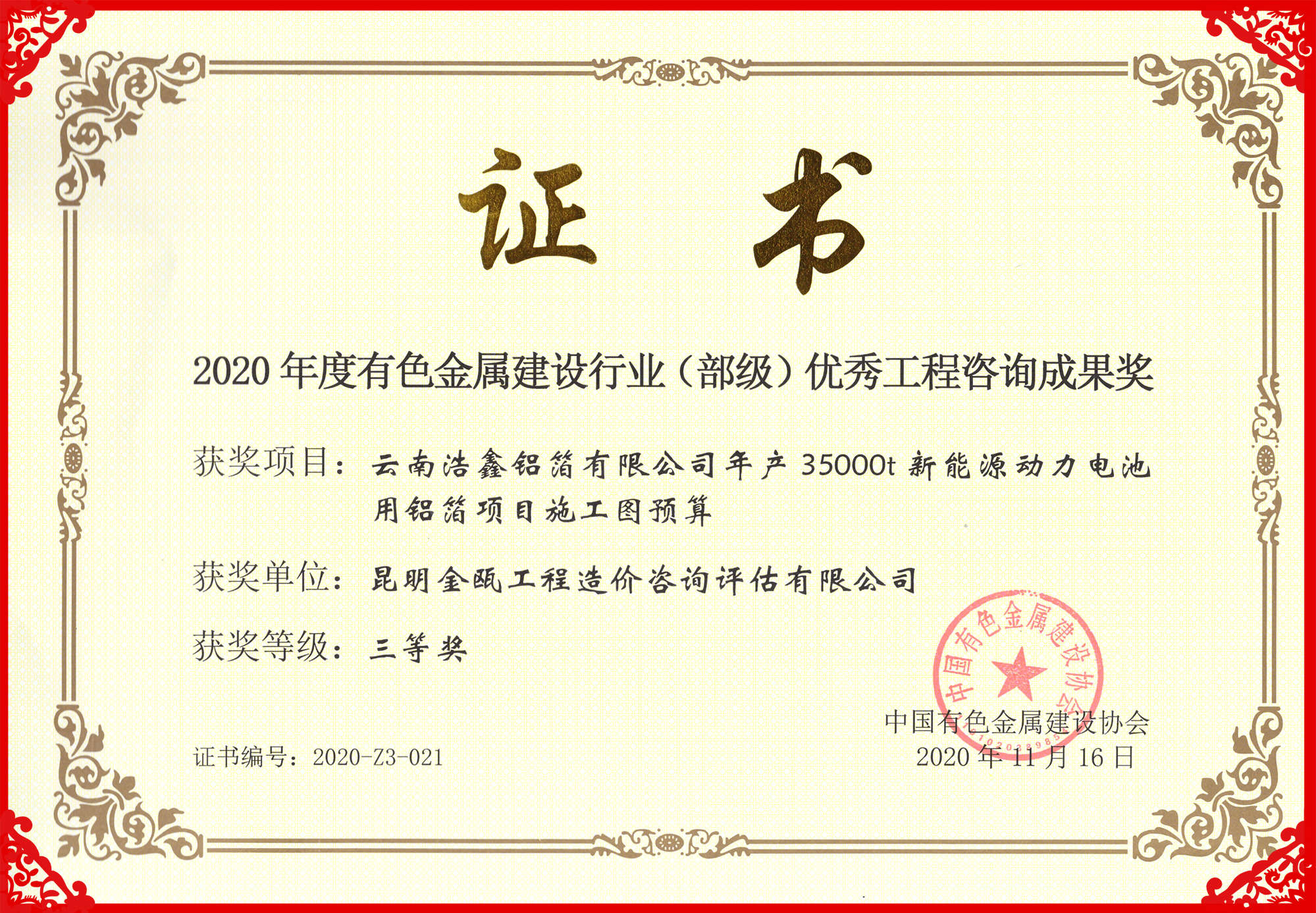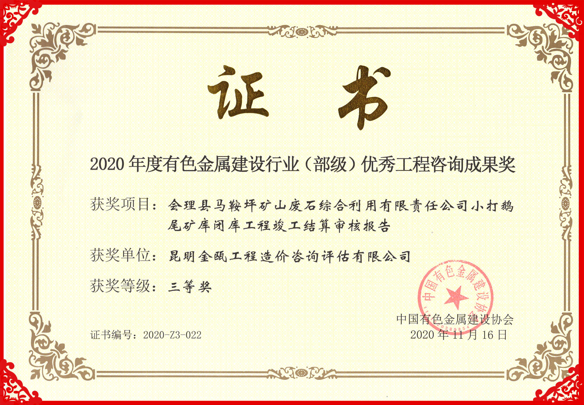 熱烈祝賀昆明金甌工程造價咨詢評估有限公司在2020年度中國有色金屬建設行業(yè)咨詢成果評獎活動中