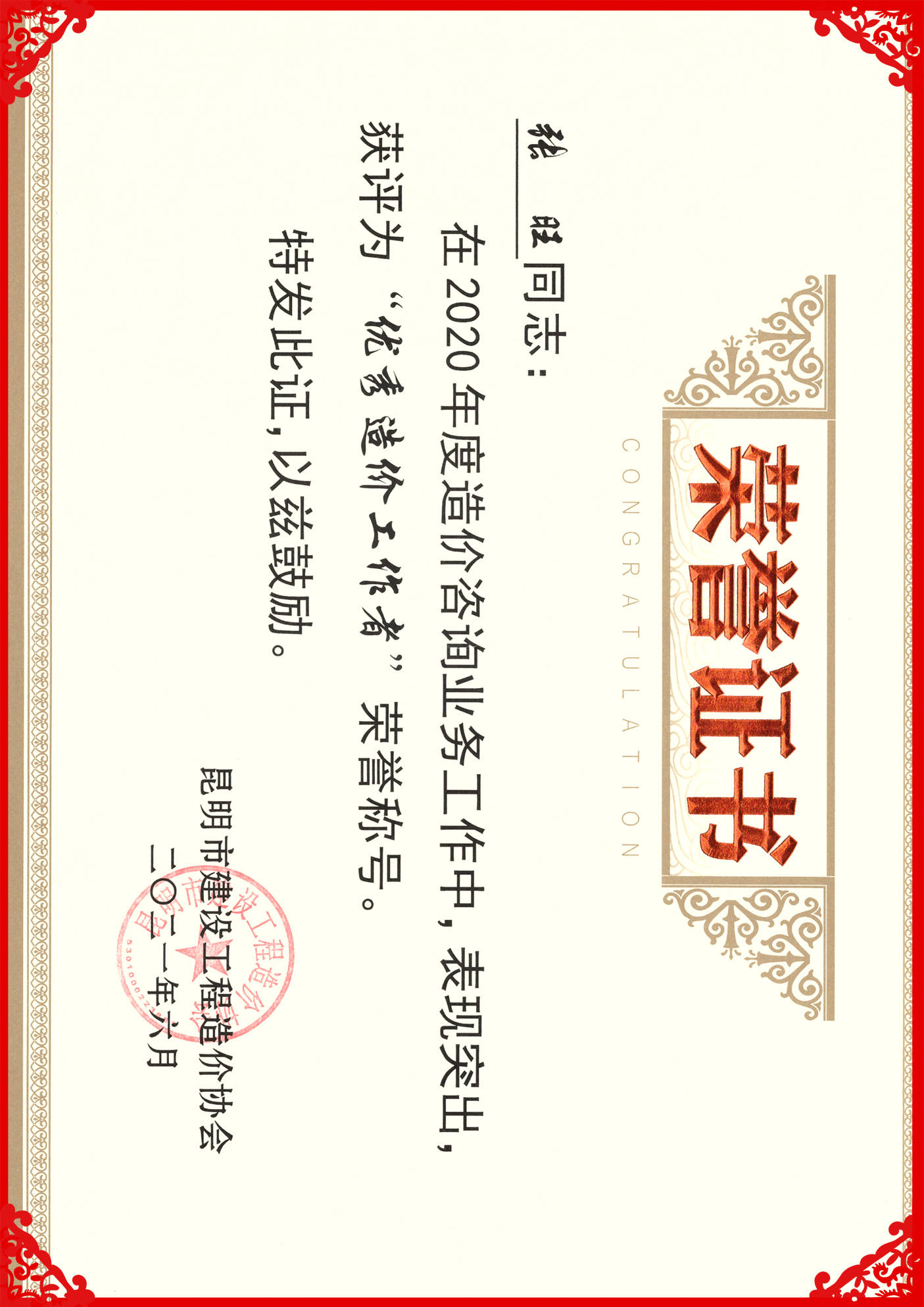 祝賀張旺、湯瓊芳同志榮獲2020年度“優(yōu)秀造價工作者”