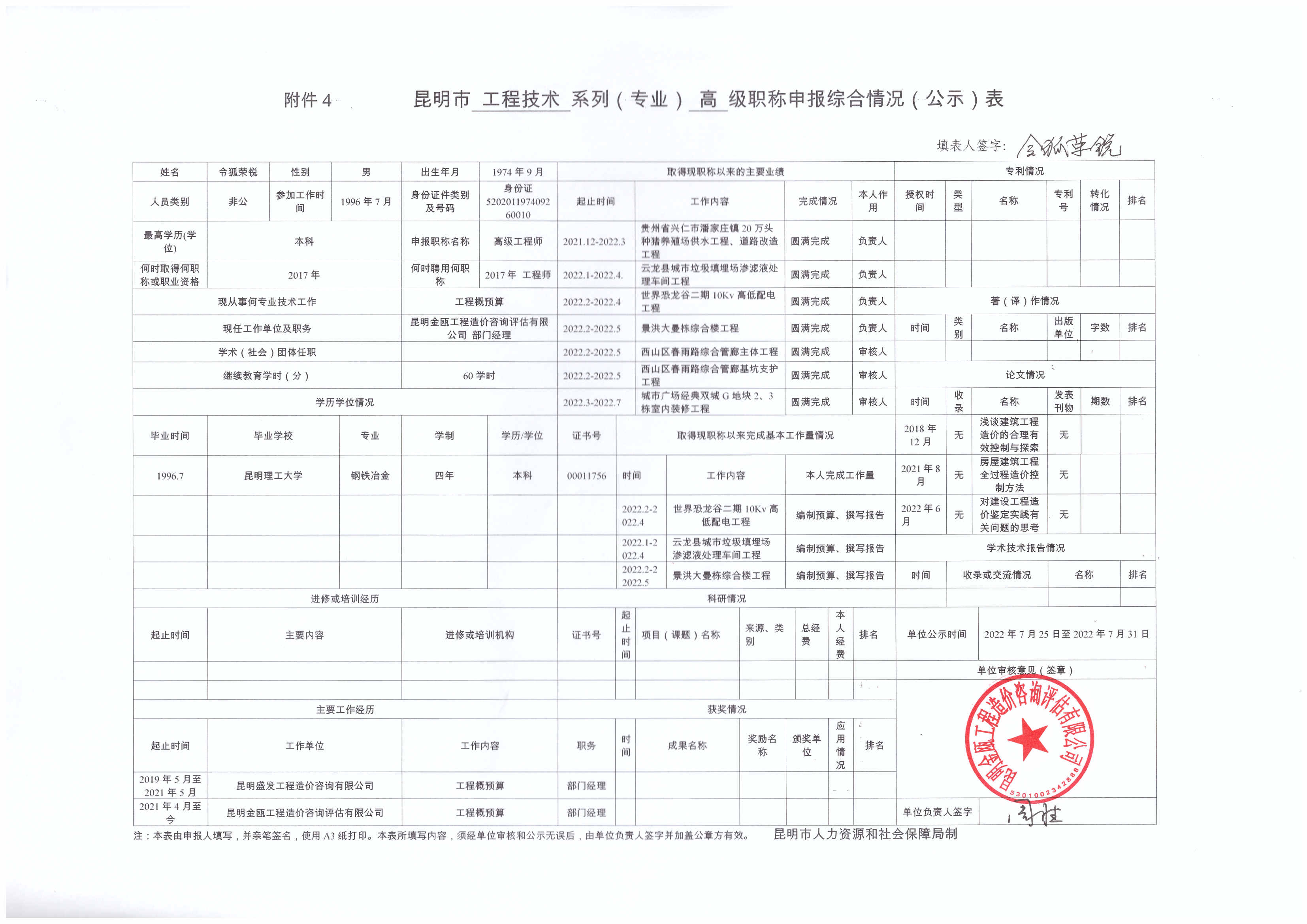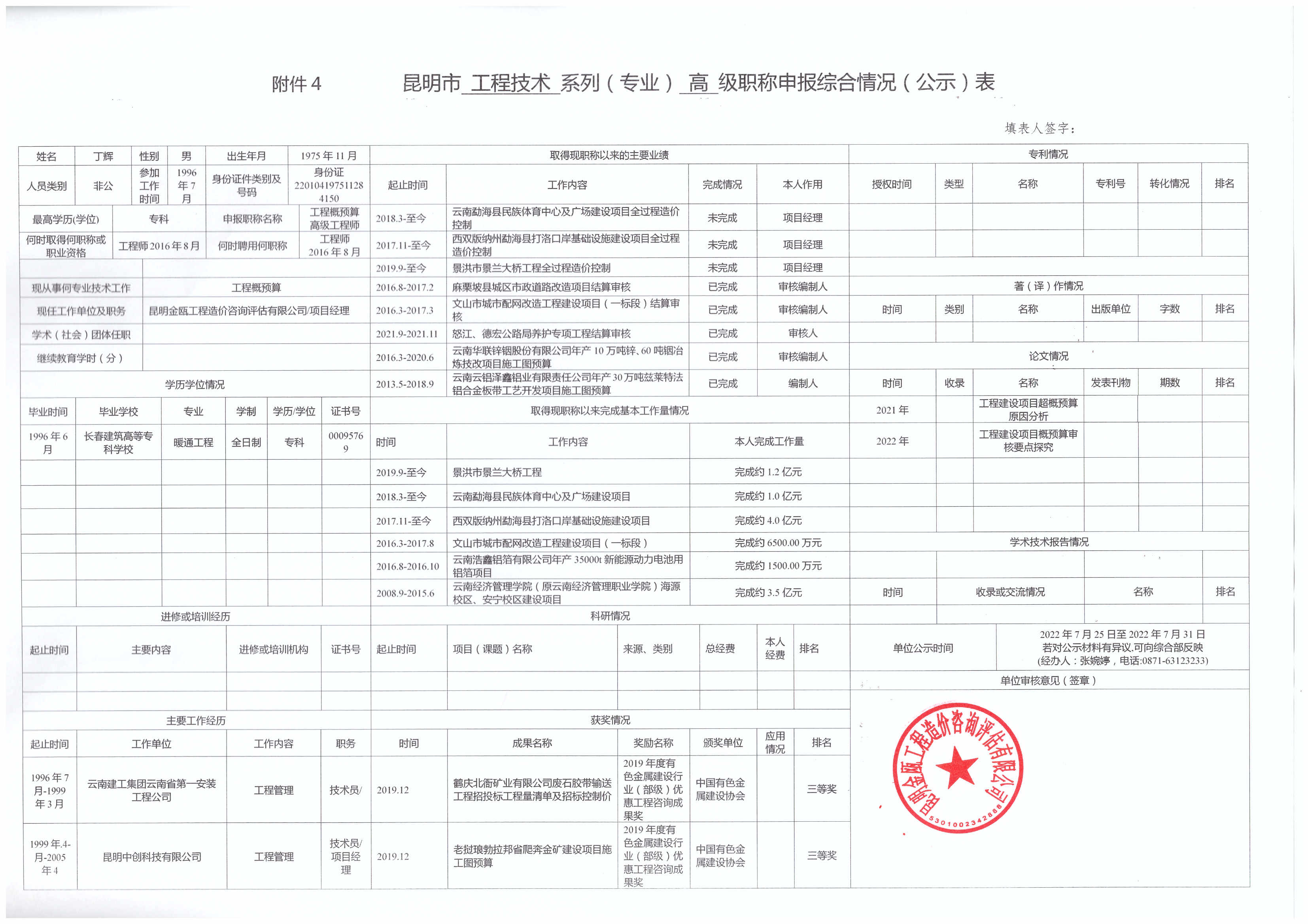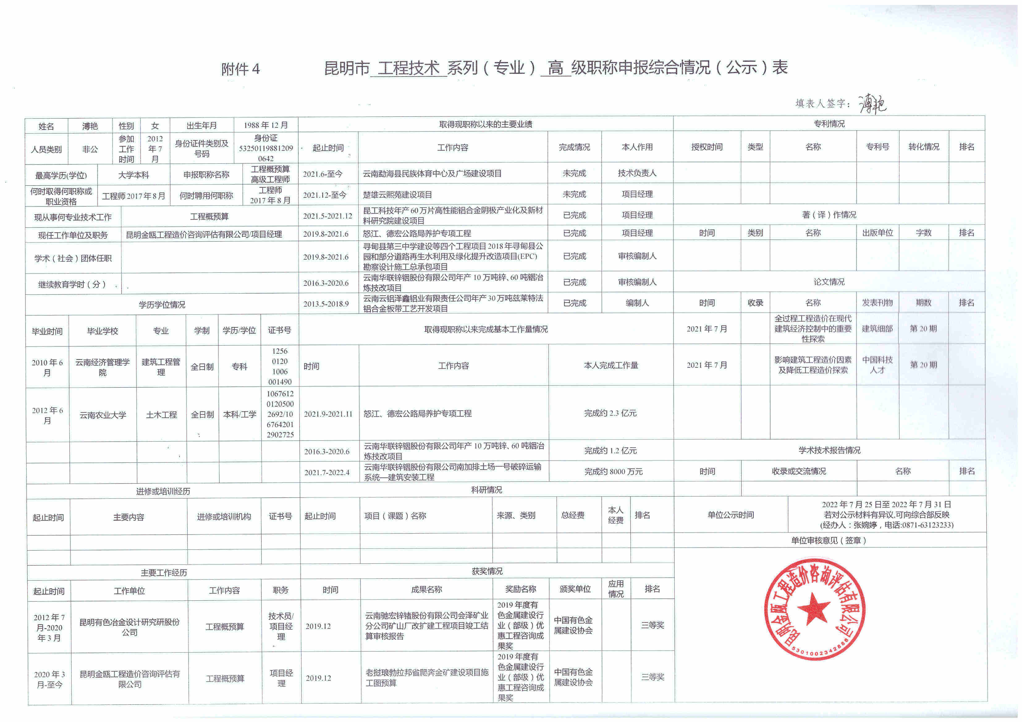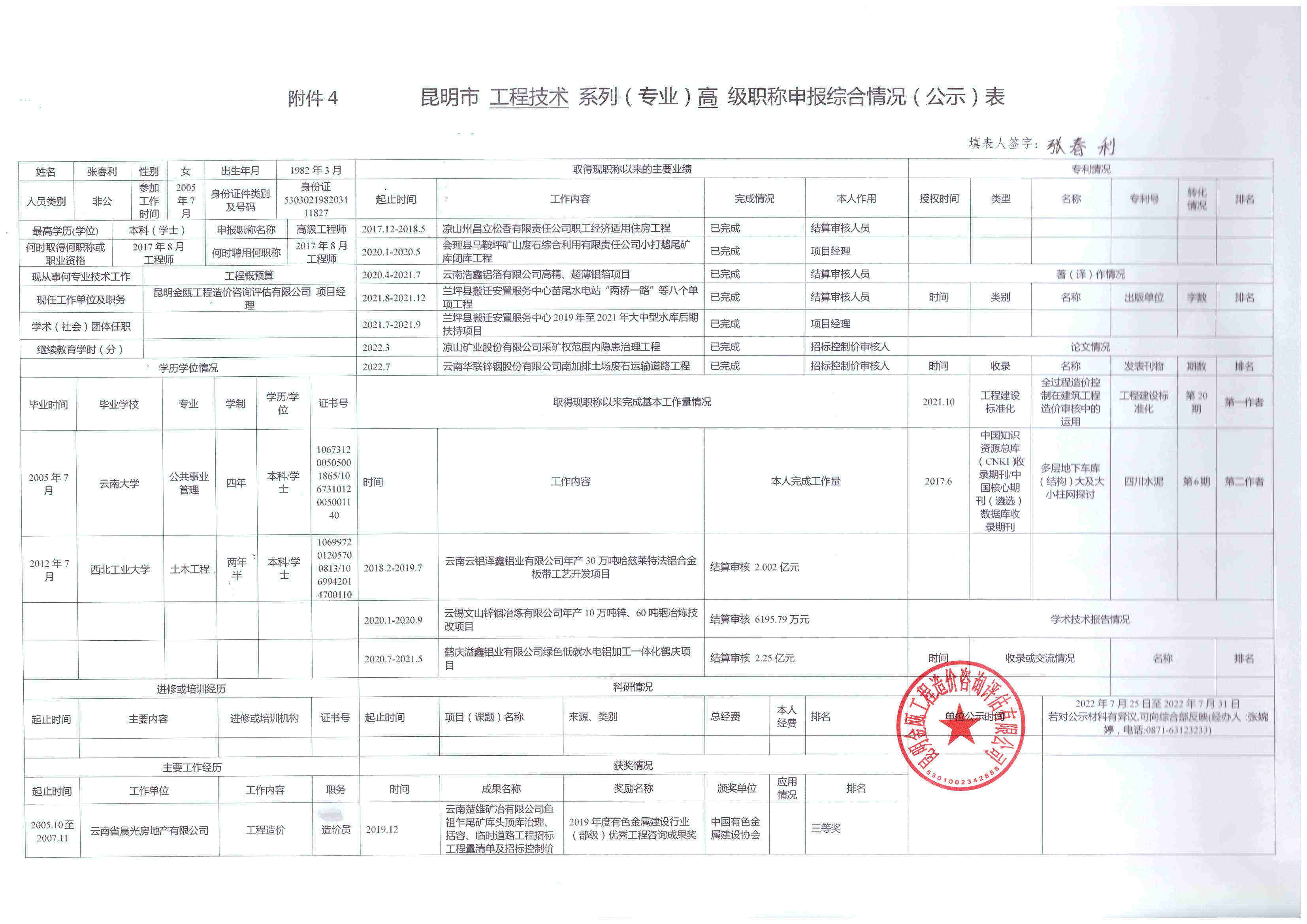 根據(jù)《云南省職稱(chēng)評(píng)審管理實(shí)施辦法(試行)》(云人社發(fā)〔2020〕57號(hào))、《關(guān)于開(kāi)展2022年專(zhuān)業(yè)技術(shù)職稱(chēng)申報(bào)評(píng)審工作的通知》(昆人社通〔2022〕54號(hào))和昆明市住房和城鄉(xiāng)建設(shè)局《關(guān)于做好2022年昆明市建筑工程初中高級(jí)職稱(chēng)申報(bào)評(píng)審工作的通知》(昆建通〔2022〕169號(hào))的相關(guān)要求,公司以下人員擬參加2022年建筑工程高級(jí)職稱(chēng)申報(bào),現(xiàn)將申報(bào)人的《昆明市職稱(chēng)申報(bào)綜合情況(公示)表》進(jìn)行公示,若對(duì)公示材料有異議,可向綜合部反映(經(jīng)辦人:張婉婷,電話(huà):0871-63123233) 。